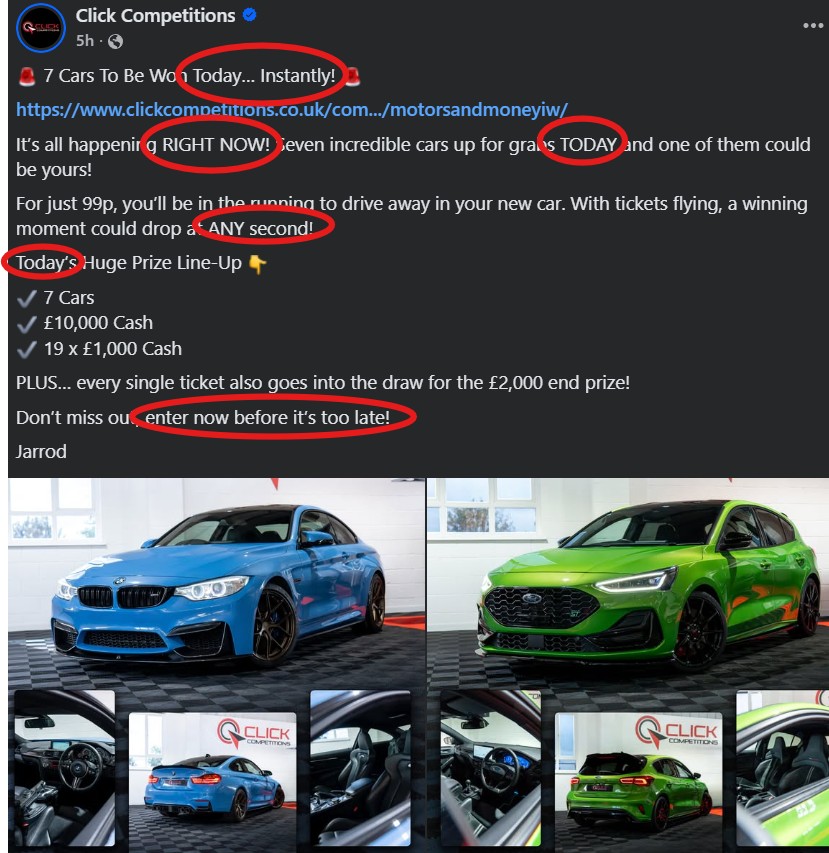 I would also like to show how consistent Click Competitions is in driving urgency in their communications and irresponsible play with some examples. This consistency is very much visible throughout everything from their adverts, social posts, and how their website is set up.