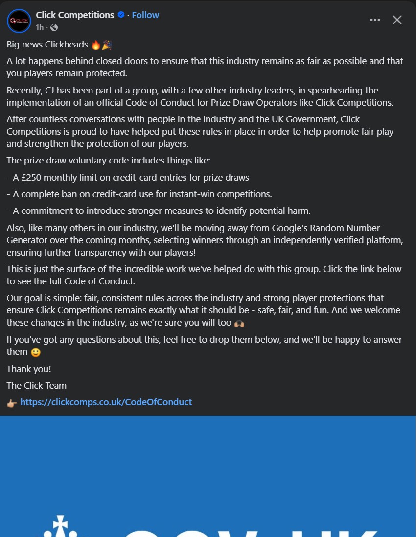 Below is a social post about a competition they had live on their website at the time they were promoting the fact that they’ve taken part in developing the Voluntary Code of Practice. Which, I would say is the best time to check as to what they are actually doing themselves if they are acting so high and mighty about it.