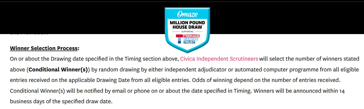 In 2020, Omaze had a mention of Civica being used for the selection process. Which sounds good as it’s a third party company that should mean that the draws are done properly and randomly.