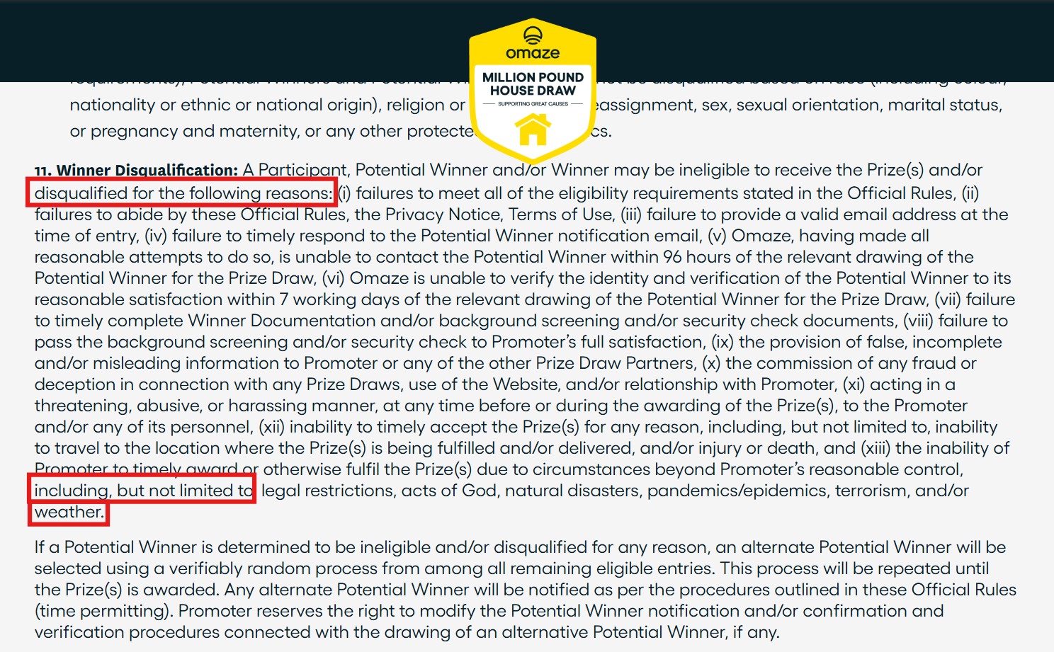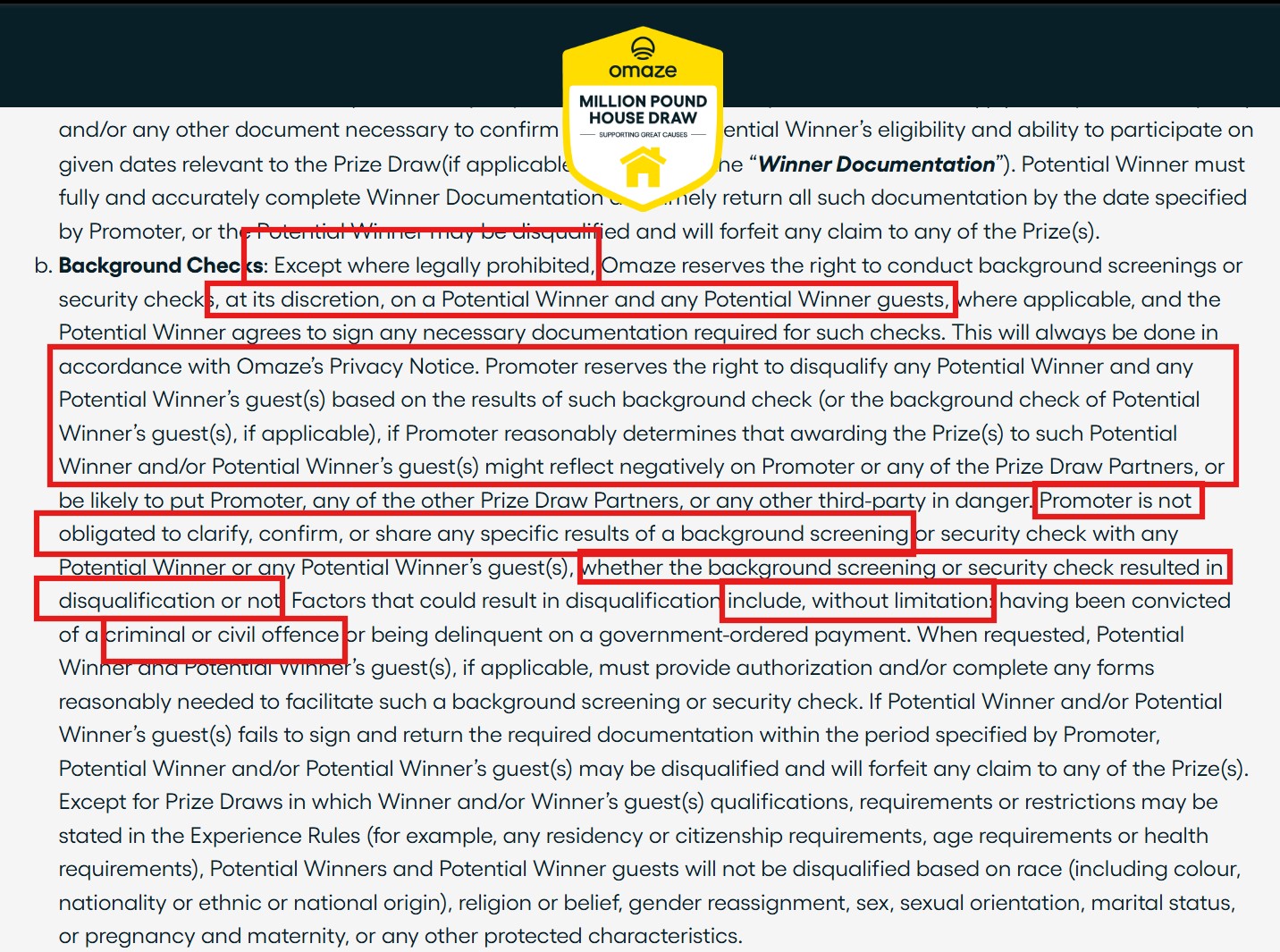But here’s where it gets a bit strange. They say that Omaze will do any screening or security check at their own discretion, and that they reserve the right to disqualify the winner of the back of these background screenings if they deem that the winner might “reflect negatively” the competition, and that these factors can include anything “without limitation”.