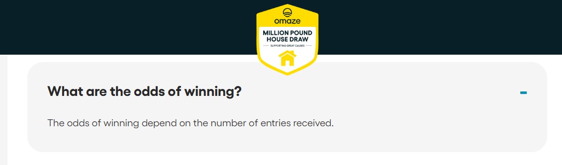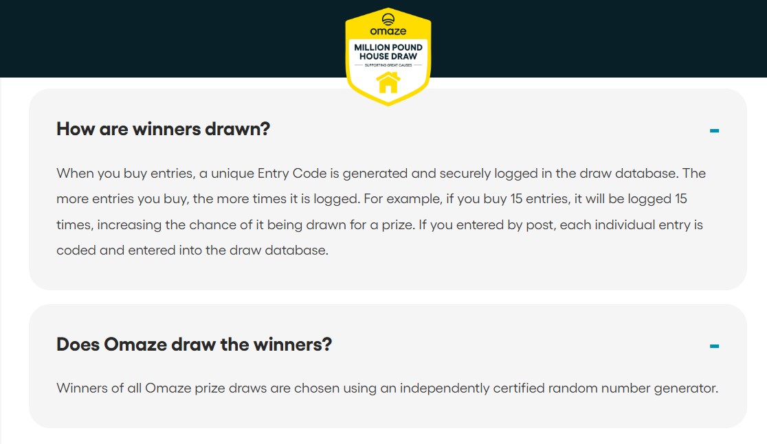 The basic information about the prizes and the company (Omaze UK Limited) are somewhat visible, and there are lots of FAQs and Terms and Conditions available on the website answering the most basic questions.