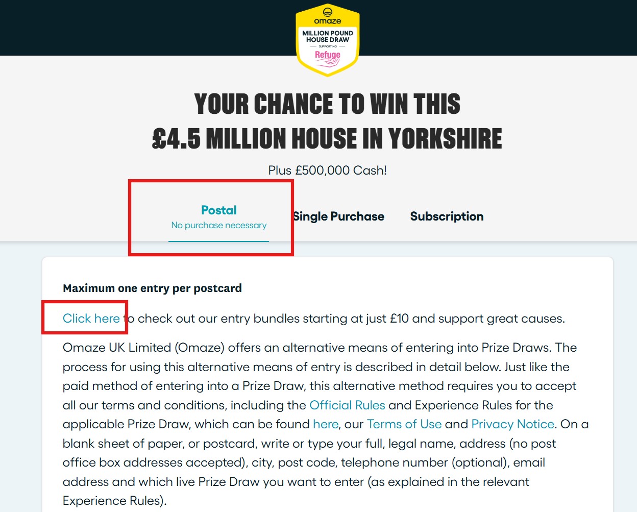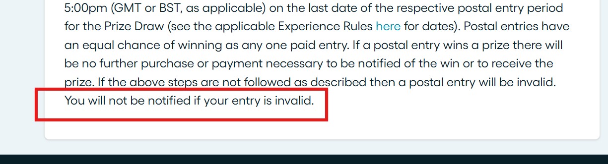 You are able to find the free entry on ‘the same level’ as the other options, which is nice, but if you click to the “Postal – No purchase necessary” tab and you click on the first highlighted ‘click here’… You are guided away from the free entry page – which is less nice and clearly designed to just sell more real entries.